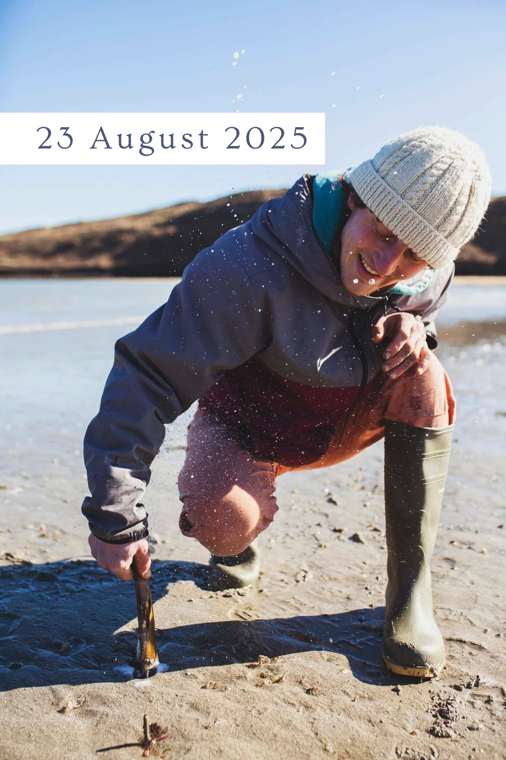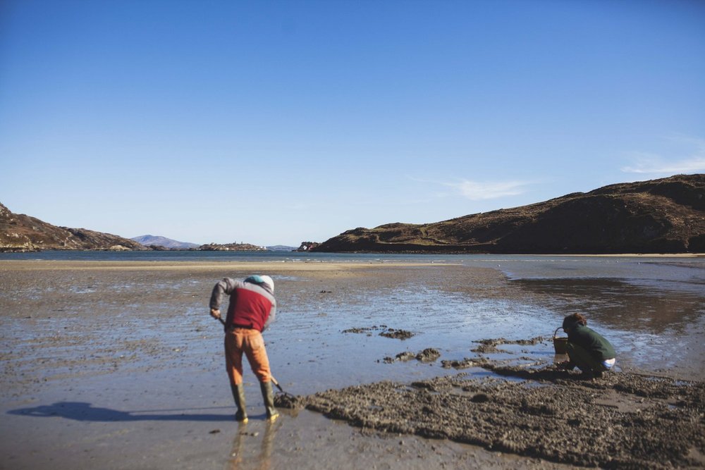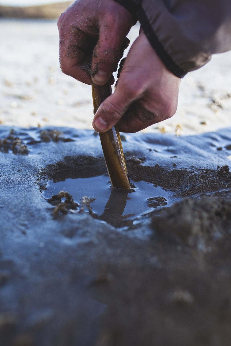 We walk the inter-tidal zone identifying areas for successful cockling, as well as reaching the wild mussel beds. These are long established patches of beautiful wild mussels, whose sandy habitat means they often contain pearls. We identify the tell-tale keyhole mark of the cunning razor-clam, and learn to use salt to coax them from their sandy holes.